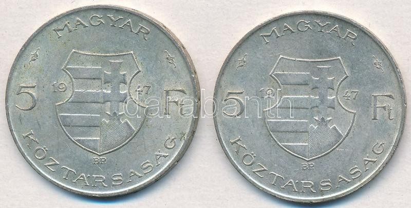 https://www.darabanth.com/en/337-Online-auction/337.0/Numismatics/Hungarian-coins-and-coins-with-Hungarian-mint-marks~1500009/1947-5Ft-Ag-Kossuth-2x-T2-3~II1888923
