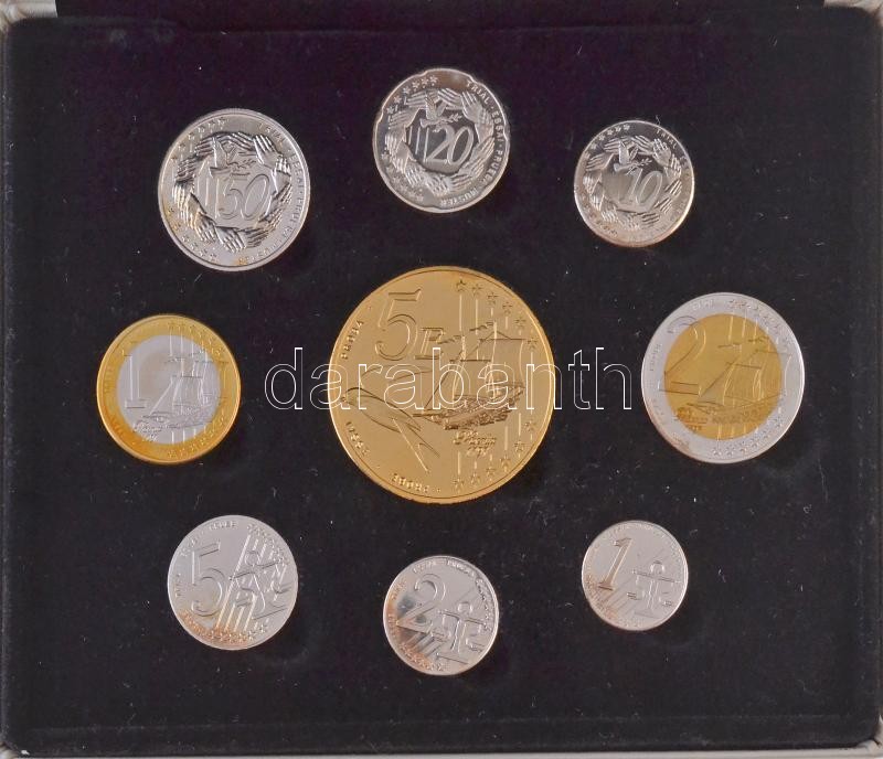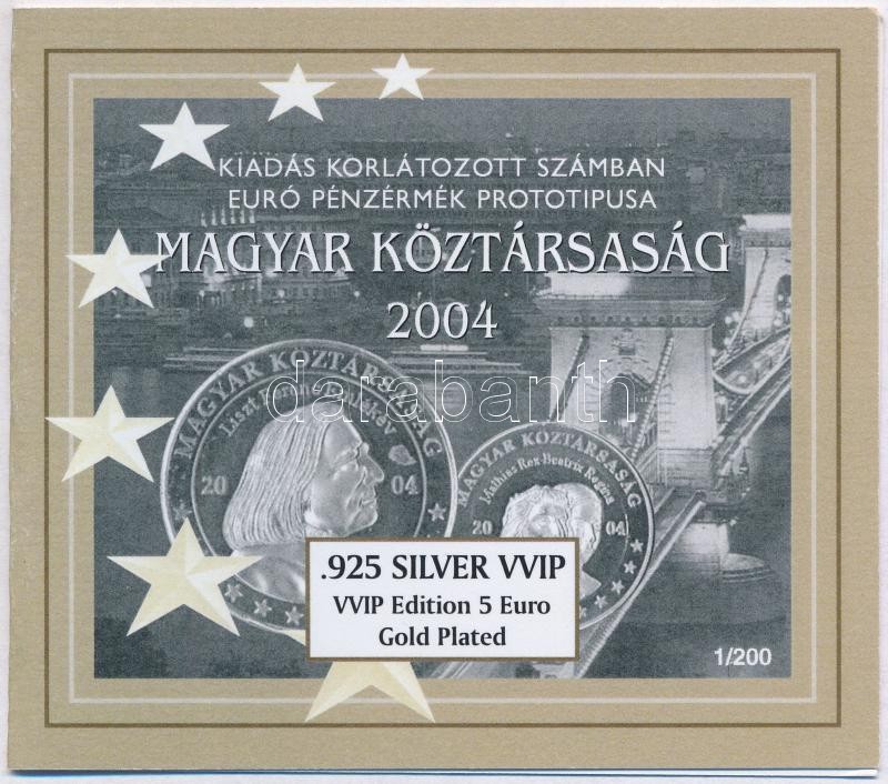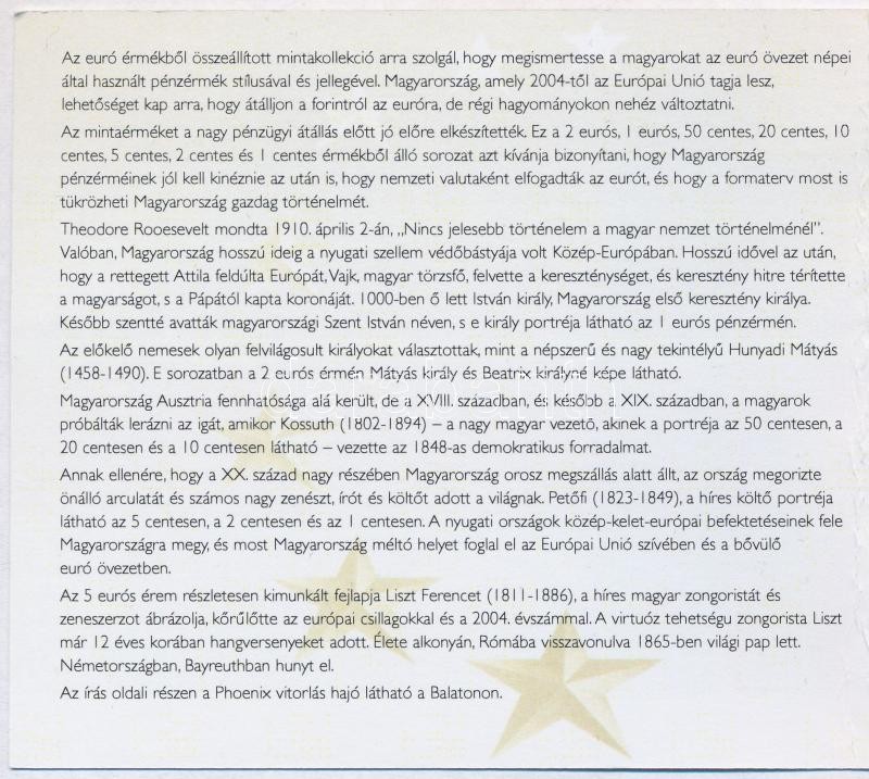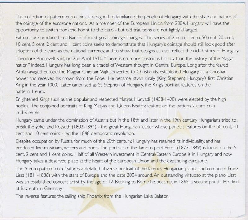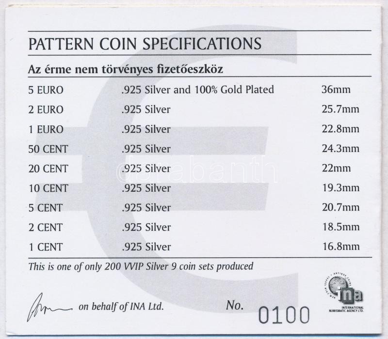 2004. 1c-2E Ag "Euro próbaveretek" (9xklf) Ag érme szett eredeti tokban, közte 2004. 5E "Liszt Ferenc emlékév" aranyozott Ag, minden érme 0.925 tisztaságú ezüst, dísztokban, sorszámozott tanúsítvánnyal "0100" T:1,1- kis patina