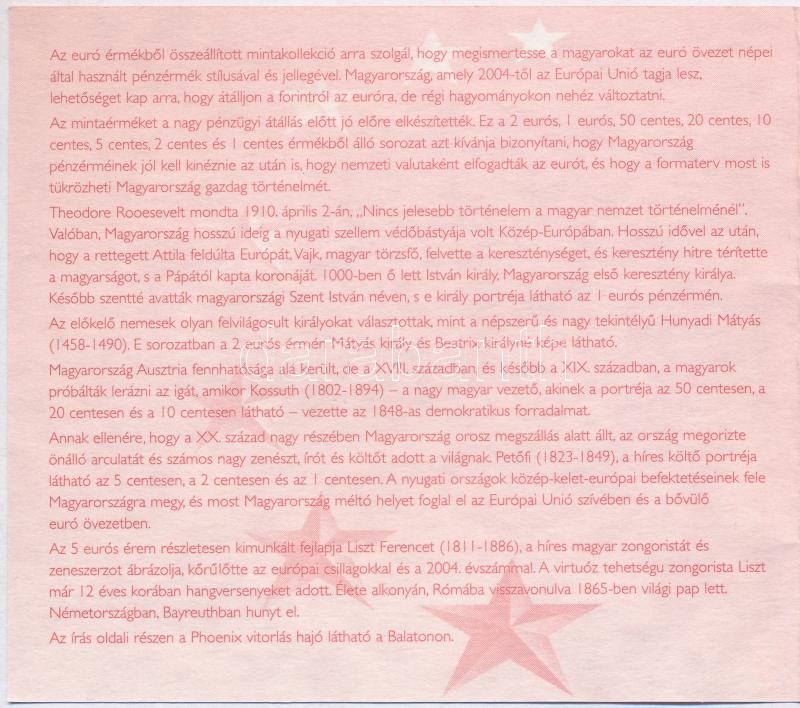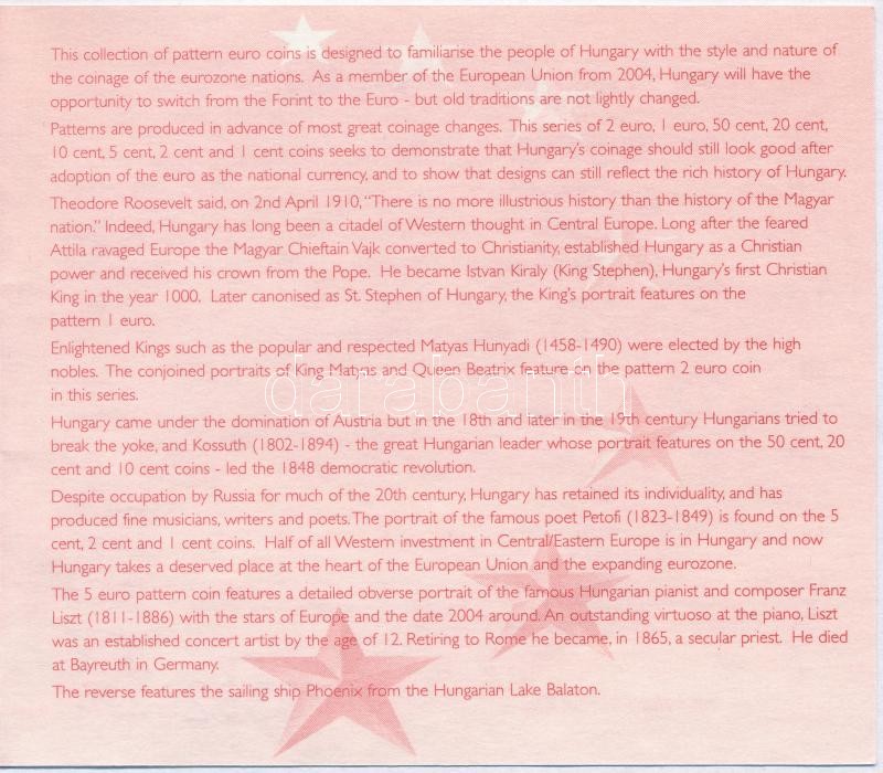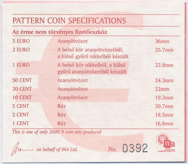 2004. 1c-5E "Euro próbaveretek" (9xklf) fémpénz szett, közte 2004. 5E "Liszt Ferenc emlékév" aranyötvözet érme, egyesével lezárt fóliába csomagolva, dísztokban, sorszámozott tanúsítvánnyal "0392" T:BU