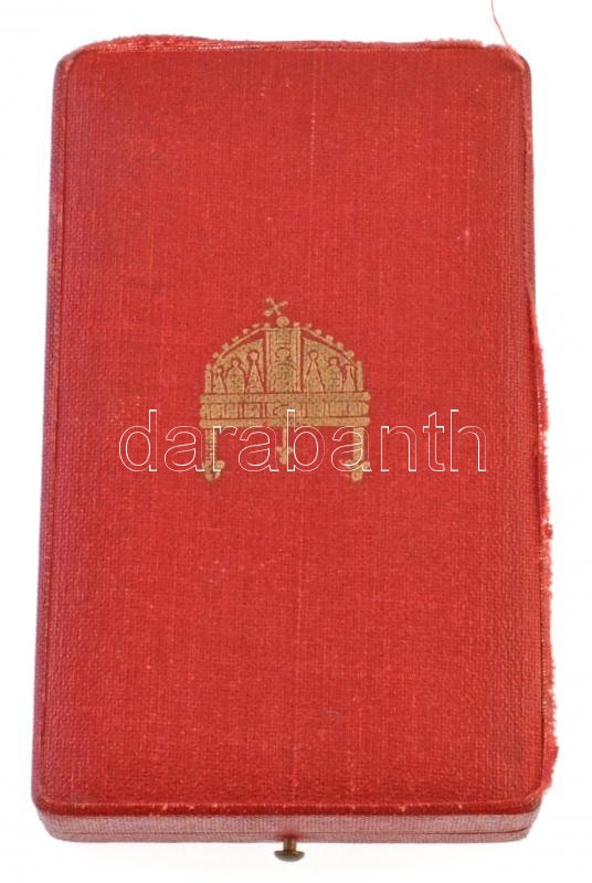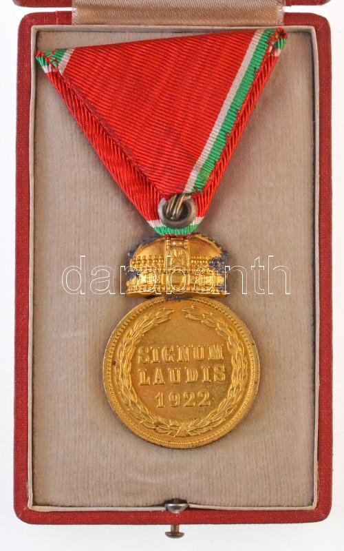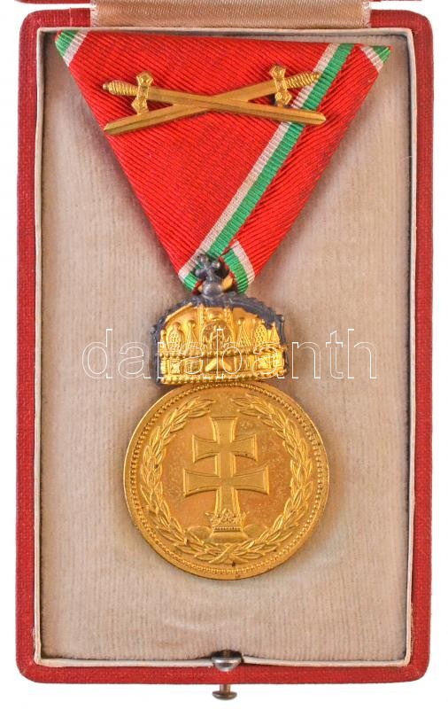 1922. "Magyar Koronás Bronzérem hadiszalagon, kardokkal" aranyozott Br kitüntetés mellszalagon, peremén "BRONZ" jelzés, eredeti dísztokban T:1-,2 aranyozás kopott a koronán