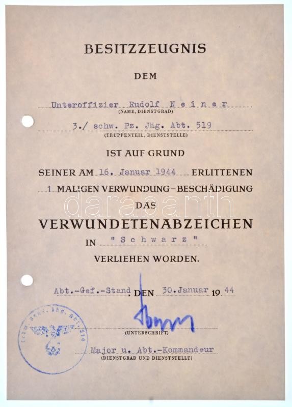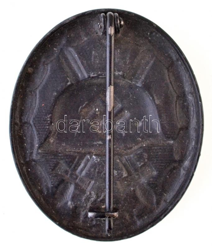 Description: Német Harmadik Birodalom 1944. "Sebesülési jelvény fekete fokozata" préselt acéllemez kitüntetés "EH 126" gyártói jelzéssel a hátoldalá, adományozói okirattal T:2 kopás