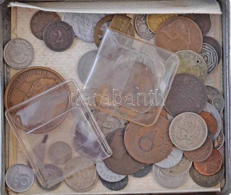 Description: Kis fémdoboznyi pénzérme és emlékérem tétel, jobb darabokkal, közte Nagy-Britannia 1863. 1p Br "Viktória", Olaszország 1862M 10c Br "II. Viktor Emánuel" T:vegyes