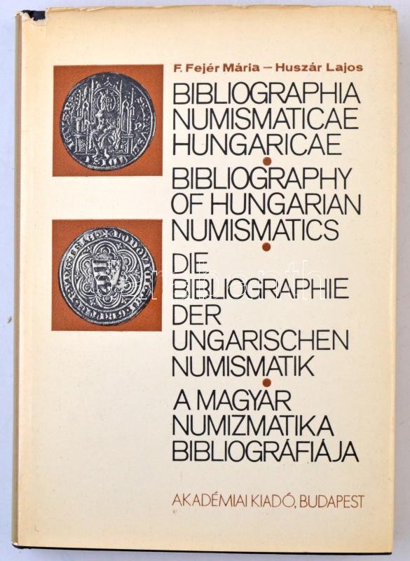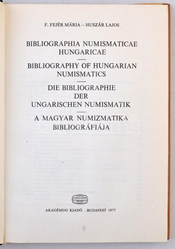 F. Fejér Mária - Huszár Lajos: A magyar numizmatika bibliográfiája, Akadémiai kiadó Budapest, 1977. Kissé sérült külső borító