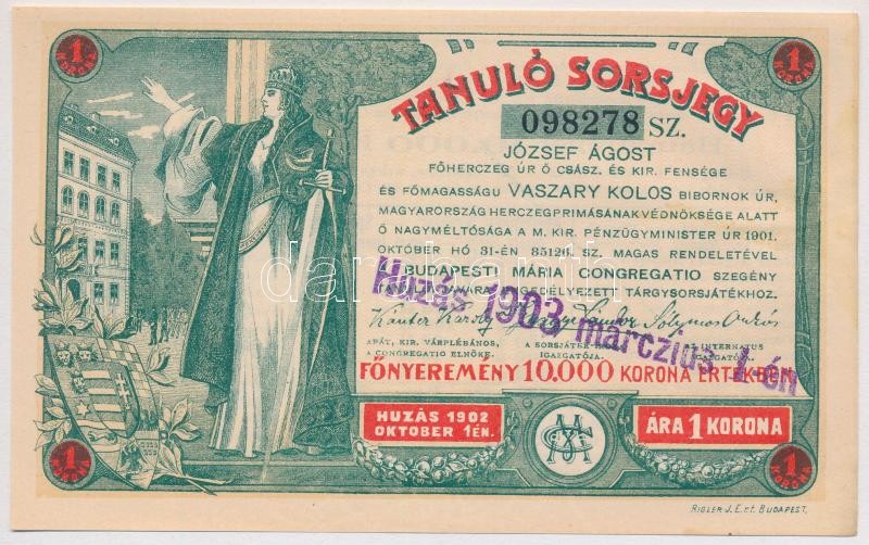 Budapest 1903. "Tanuló Sorsjegy" 1K értékben, felülbélyegzés...
