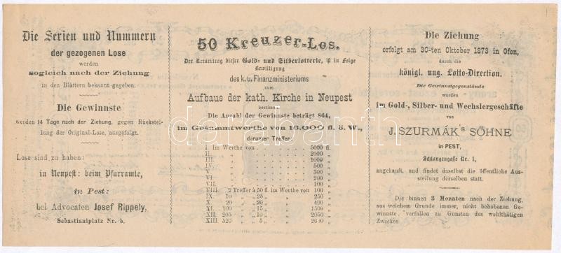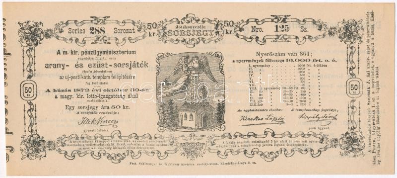 Description: Budapest / Pest 1873. "A Magyar Királyi Pénzügyminisztérium arany- és ezüst sorsjátéka az Újpesti Katolikus Templom felépítésének javára" 50kr értékben T:I-