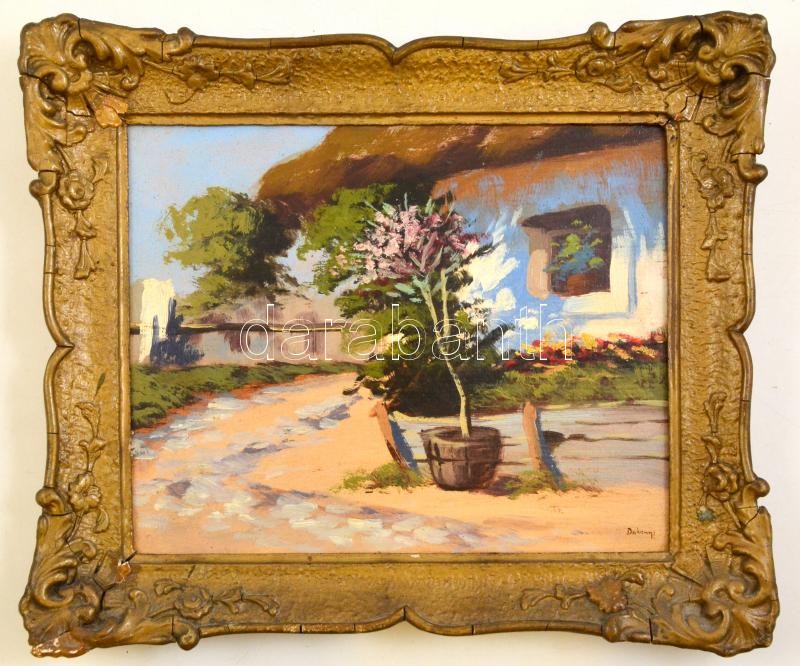 Bakonyi jelzéssel: Házudvar virágokkal. Olaj, karon, keretben, 20×25 c...