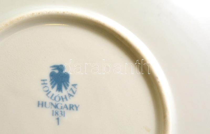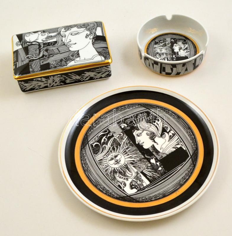 Hollóházi Szász Endre által tervezett hamutartó, doboz, tányér, matricás, jelzett, aranyozás kissé kopott, d:20 cm, d:10 cm, 13,5×9 cm