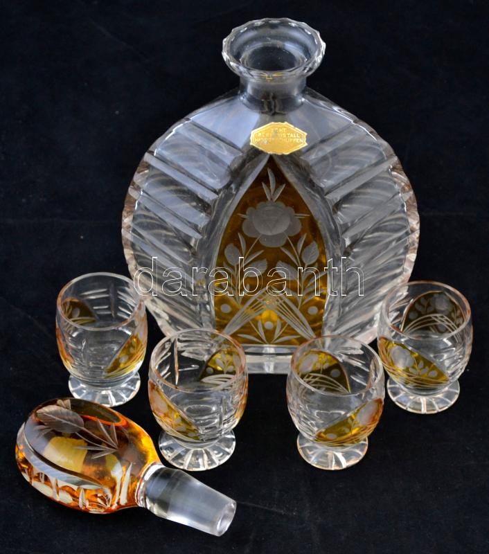 Üveg kiöntő dugóval + 4 db hozzá illő kupica, hibátlanok, a dugón kis üvegtesten belüli repedéssel