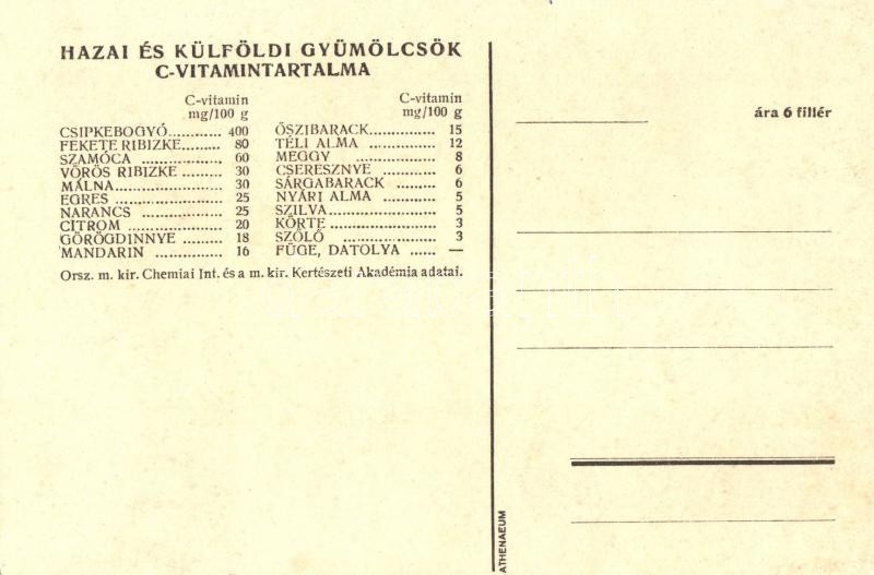 Nyári munkánál is gyümölcs! Magyar egészségügyi propaganda, C-vitamin táblázat a hátoldalon / Hungarian health campaign propaganda, Vitamin C chart
