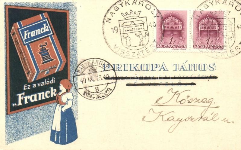 Description: Prikopa János, a Franck Henrik fiai Pótkávégyár képviselője. Névjegy reklámlap / Representative of the Hungarian coffee substitutes factory. Business card advertisement "1940 Nagykároly visszatért" So. Stpl