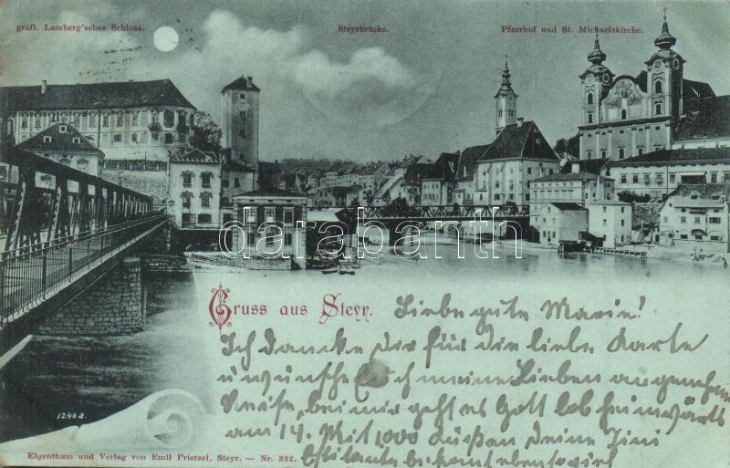 1899 Steyr, Steyrbrücke, Pfarrhof und St. Michaelskirche / bridge, church. night