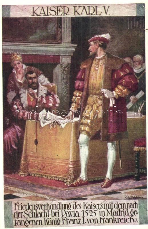 Kaiser Karl V. Friedensverhandlung des Kaisers mit dem nach der Schlac... https://www.darabanth.com/en/337-Online-auction/337.0/Postcards/Emperors-Politicians-Royal-families~2000081/Kaiser-Karl-V-Friedensverhandlung-des-Kaisers-mit-dem-nach-der-Schlacht-bei-Pavia-1525-in-Madrid-ge~II1892045
