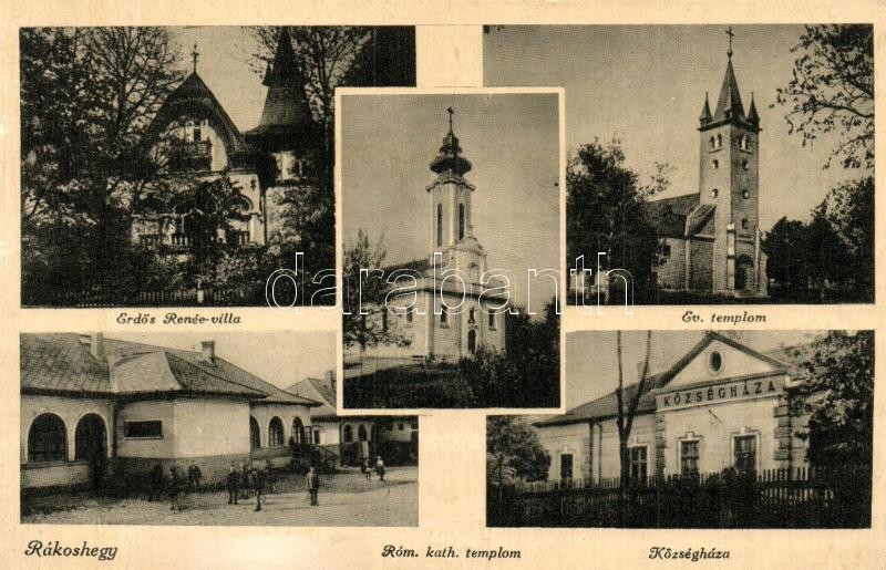 Budapest XVII. Rákoshegy, Erdős Renée villa, Evangélikus templom, Római katolikus templom, Községháza (EK)