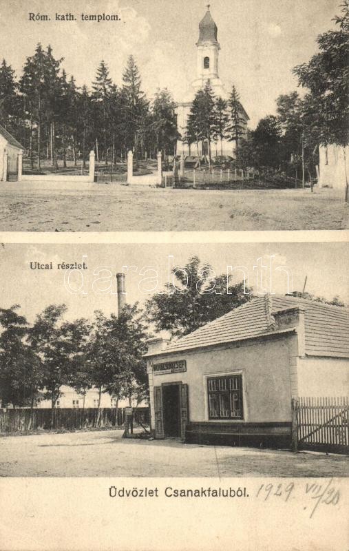 Csanakfalu, Ménfőcsanak (Győr); Római katolikus templom, utca, Kovács József üzlete és saját kiadása