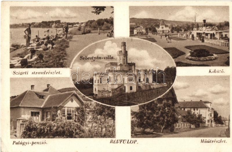 Révfülöp, Szigeti strand, napozók, fürdőzők, Sebestyén villa, Kikötő, Műút, Palágyi penzió (EK)