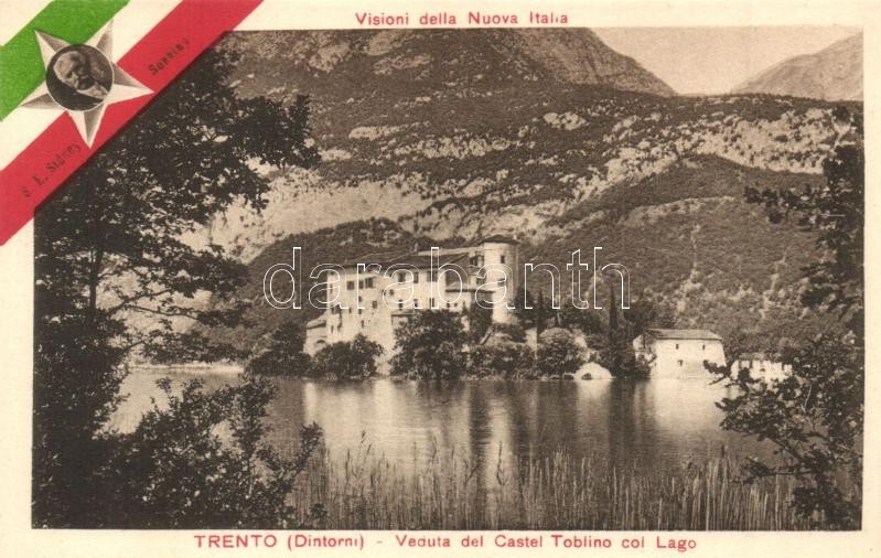 Description: Trento, Trient (Südtirol); Veduta del Castel Toblino col Lago. Visioni della Nuova Italia, S. E. Sidney Sonnino / Toblino Castle. Italian flag, patriotic irredenta motive with the portrait of Prime Minister Sidney Sonnino