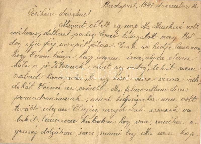 Description: 1943 Bleier Zsigmondné levele férjének Bleier Zsigmond zsidó KMSZ-nek (közérdekű munkaszolgálatos) 109/33. a miskolci munkatáborba / WWII Letter for a Jewish labor serviceman from his wife to the labor camp of Miskolc. Judaica (fa)