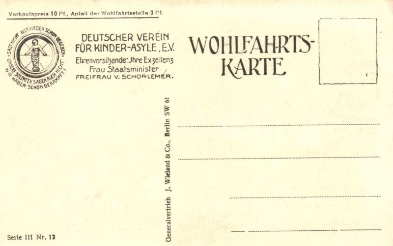 Description: Im Kinder-Asyl. Denkt an unsere Krieger Waisen! Deutscher Verein für Kinder-Asyle. Ehrenvorsitzende Ihre Exzellenz Frau Staatsminister Freifrau v. Schorlemer Sereie III. Nr. 13. / WWI German Association for Children's Asylums. Propaganda card (EK)