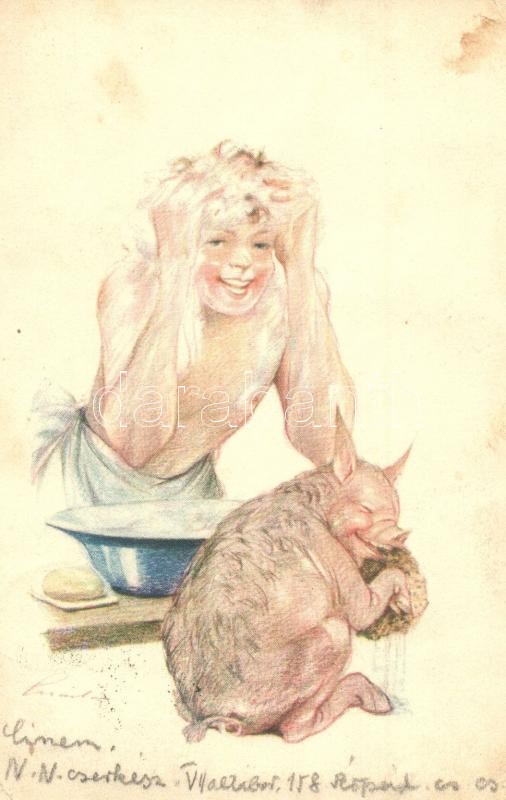 A cserkész tiszta. A Magyar Cserkészszövetség kiadása / Hungarian boy scout art postcard with pig s: Márton L. (EK)