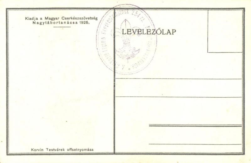Kiadja a Magyar Cserkészszövetség Nagytábortanácsa 1926. / Hungarian b... https://www.darabanth.com/en/337-Online-auction/337.0/Postcards/Scout~2000056/Kiadja-a-Magyar-Cserkeszszovetseg-Nagytabortanacsa-1926-Hungarian-boy-scout-art-postcard-s-~II1892021