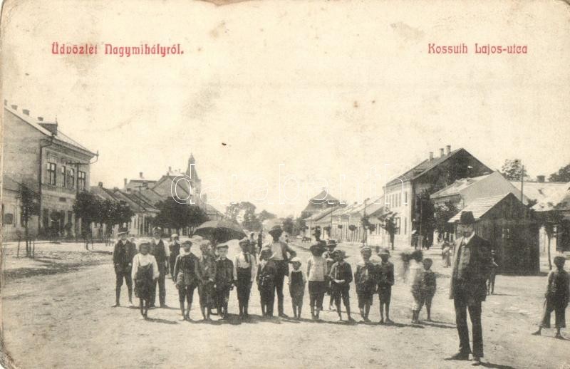 1914 Nagymihály, Michalovce; Kossuth Lajos utca, gyerekek. Kiadja Freireich T. / street view, children (ragasztónyom / glue marks)
