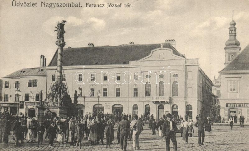 Nagyszombat, Tyrnau, Trnava; Ferenc József tér, Szentháromság szobor, Magran Miksa és fia, Smekel és fia és Bauer Károly üzlete, piaci árusok. Winter Zsigmond kiadása / square, Trinity statue, shops, market vendors