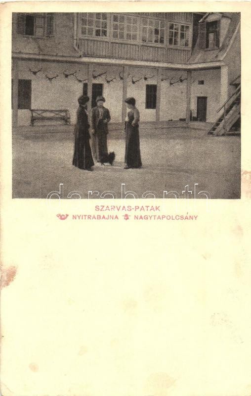 Description: Szarvas-patak (Nyitrabajna közelében / near Bojná), hölgyek kutyával egy kúria vagy vadászlak udvarán / ladies with a dog at the courtyard of a villa or hunting lodge (Rb)