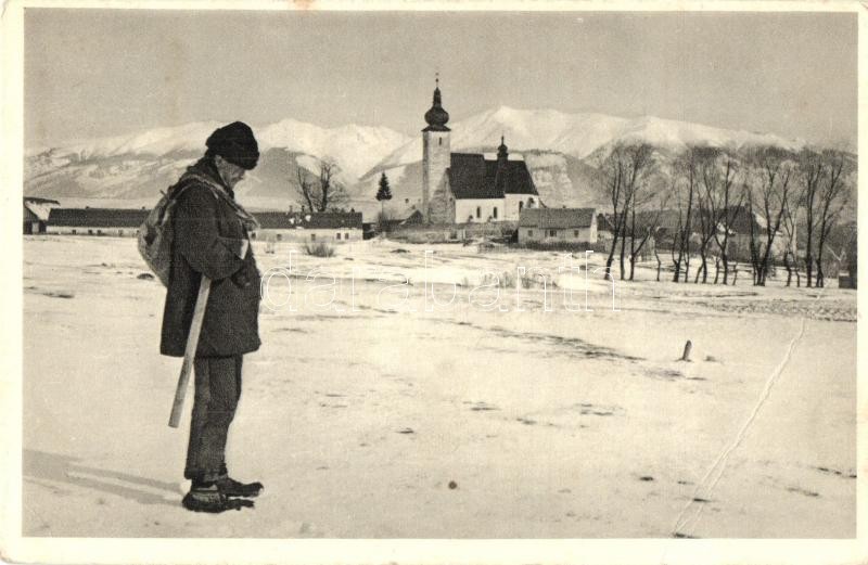 Description: Szentiván, Liptovsky Sv. Ján; Vánocni a novorocní pozdrav / Karácsonyi és szilveszteri üdvözlet! Római katolikus templom télen. K. Klimes felvétele, Spolek kiadása / Christmas and New Year greetings! Catholic church in winter (EB)