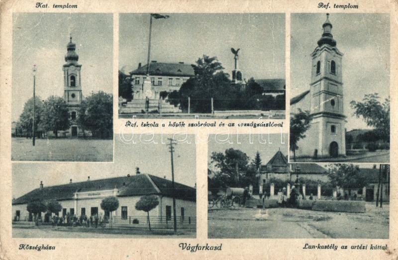 Vágfarkasd, Forcas, Vlkad nad Váhom, Vlcany; Községháza, Katolikus templom, Református templom és iskola. Hősök szobra és országzászló, Lun kastély az artézi kúttal / town hall, churches, Calvinist school, castle, heroes monument, Hungarian flag, well (gyűrődések / creases)