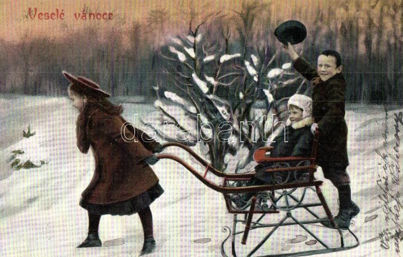 Veselé vánoce / Christmas greeting art postcard with sled drawn by a g...