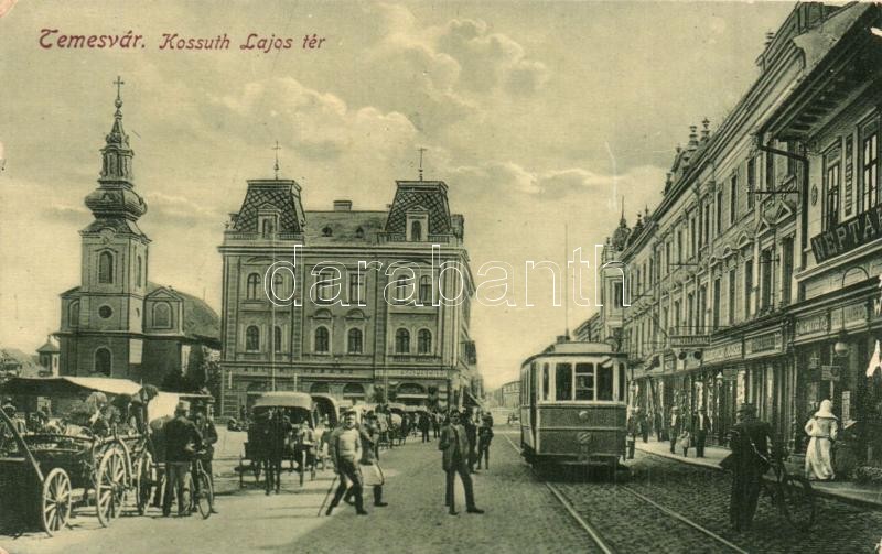 Temesvár, Timisoara; Kossuth Lajos tér, villamos, lovaskocsik, templom, Adler Ignácz, Csendes és Fischer, Altmayer és Szobovich üzlete, Porcelánház. Gerő Manó kiadása / square, tram, shops, horse carts, church, porcelain store