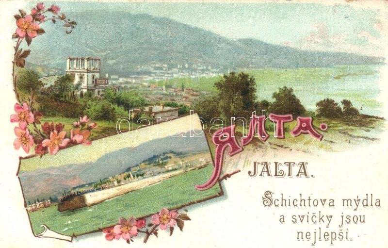 Yalta, Jalta; Schichtova mydla a svicky jsou nejlepsi / Jirí Schicht's soap advertisement on the backside. Art Nouveau, floral, litho (non PC)