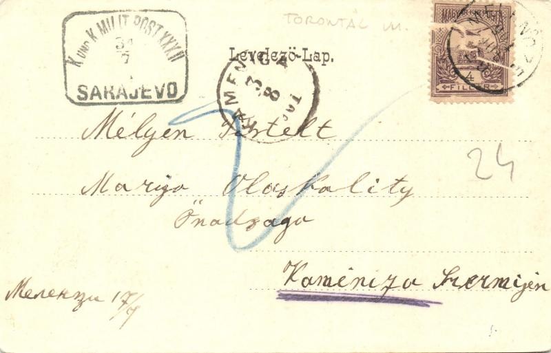 Description: 1901 Melence, Melenze, Melenci; Schlammbad / iszapfürdő, fürdőház. Felvette és kiadja Oldal / mud bath, bathing house, spa + K.u.K. Milit. Post. XXXII Sarajevo (EK)