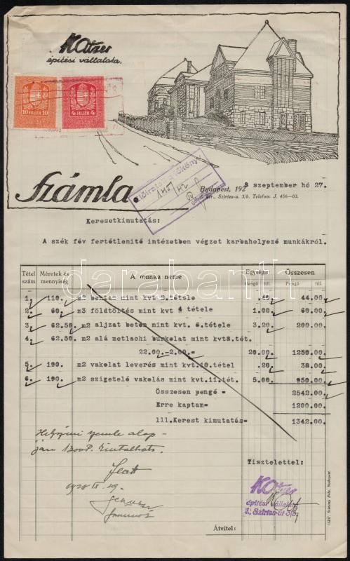 1928 Bp., Katzer építési vállalatának díszes fejléces számlája okmánybélyegekkel