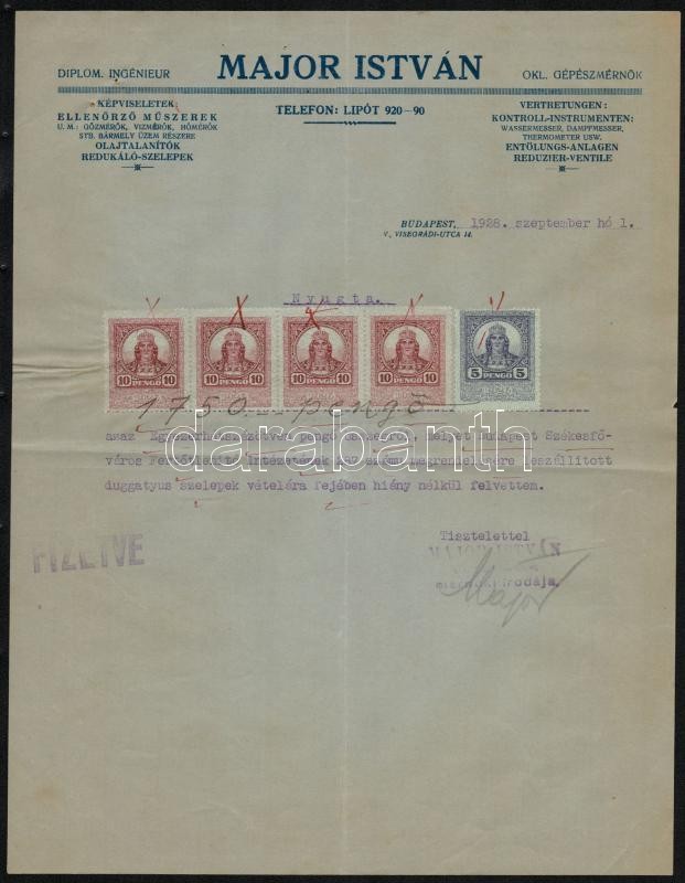 1928 Bp., Major István okleveles gépészmérnök fejléces levélpapírjára írt nyugta okmánybélyegekkel