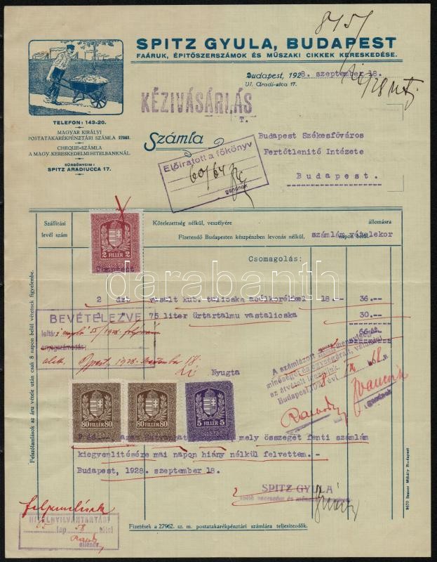 1928 Bp., Spitz Gyula Faáruk, Építőszerszámok és Műszaki Cikkek Kereskedésének díszes fejléces számlája okmánybélyegekkel