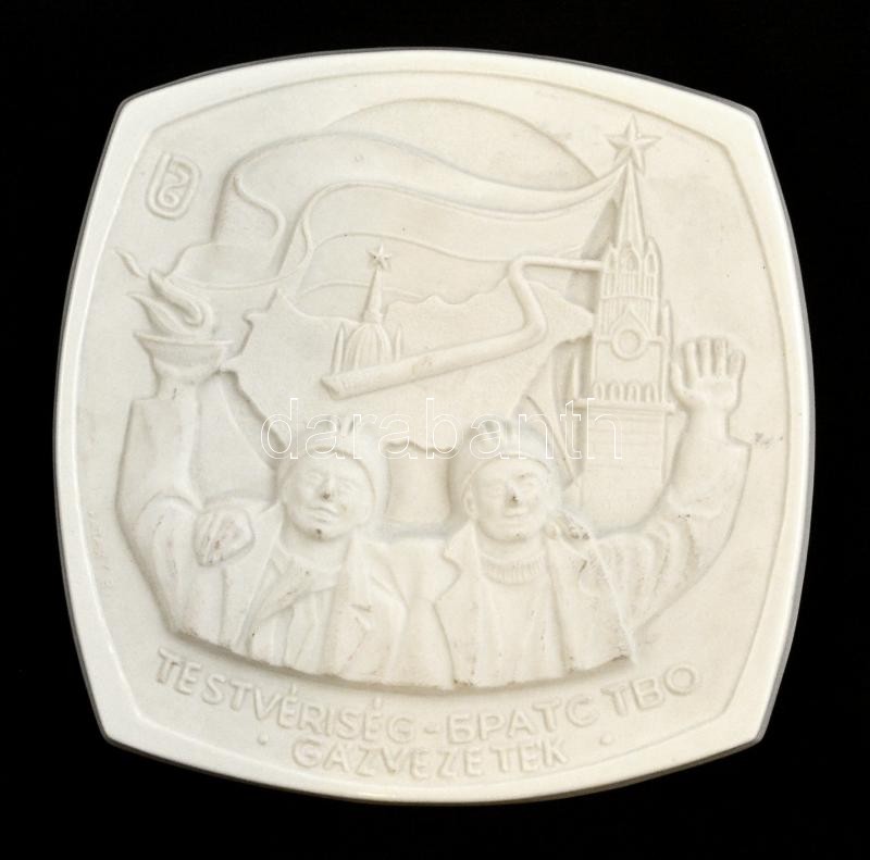 Hollóházi Testvériség gázvezeték, biszkvit porcelán plakett, jelzett, kopott, 15×15 cm
