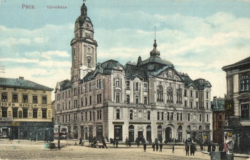 Pécs, Városháza, villamos, Steiner Simon, Domján I., Kemény Mór, Kovács Bernát, Taussig, Paunz Jakab fia és Vigan Károly üzlete, gyógyszertár, drogéria (EK)