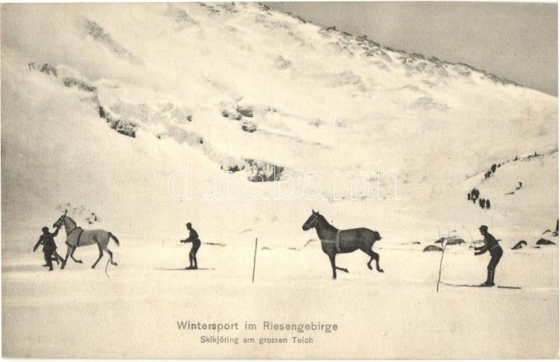 Wintersport im Riesengebirge, Skikjöring am grossen Teich / Skijoring with horses on the frozen lake, winter sport