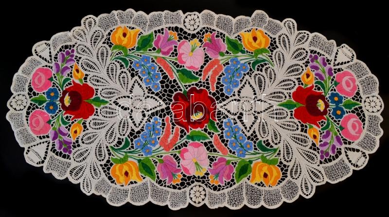 Kalocsai mintás terítő, kézzel és géppel (riselin) hímzett, jó állapo...