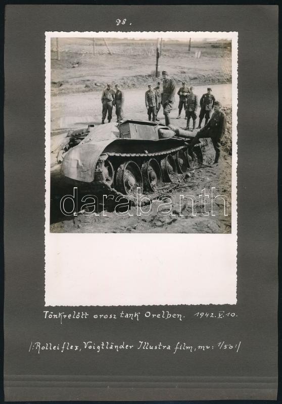 Description: 1942 Brianszk német tüzérség lövi a partizánokat, Szétlőtt orosz tank Orelben magyar katonákkal. 2 db jó minőségű fotó Ferdinkó Béla fotóstól feliratozva, a használt gép és film megjelölésével. Albumlapon. / 1942 Eastern front of WW II. Two photos of German and Hungarian units. Photo size: 13x18 cm