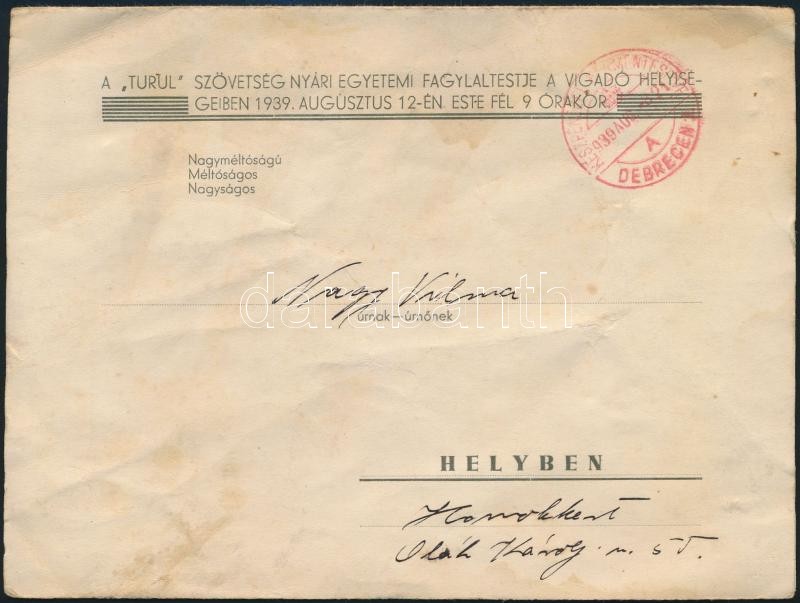 1939 Meghívó a Turul Szövetség fagylaltestjére, foltos