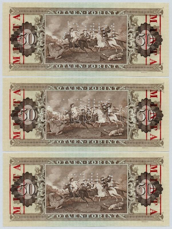Hungary 1989. 50 Forint with "MINTA(SPECIMEN)" overprint and perforation (7x) sequential serials "D273 000215 - D273 000221" serial numbers C:UNC