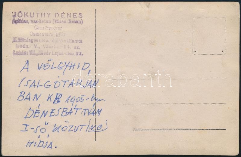 Description: cca 1905 Jókuthy Dénes építész és az általa tervezett salgótarjáni közúti híd építés közben, fotó hátoldalon feliratozva, pecséttel jelzett, felületén törésnyomokkal, 13,5×9 cm