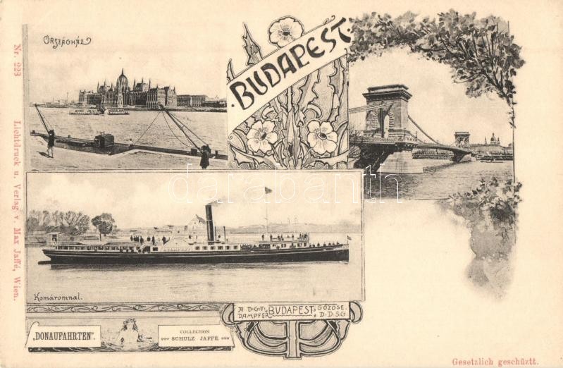 Description: 1900 "Budapest" gőzüzemű oldalkerekes személyhajó Budapesten a Lánchídnál és az Országháznál, valamint Komáromnál / "Donaufahrten" An Bord des Dampfers "Budapest" der DDSG, Budapest, Komárno. Lichtdruck u. Verlag v. Max Jaffé, Wien / on the board of passenger steamship "Budapest". Schulz-Jaffe Collection. Art Nouveau, floral