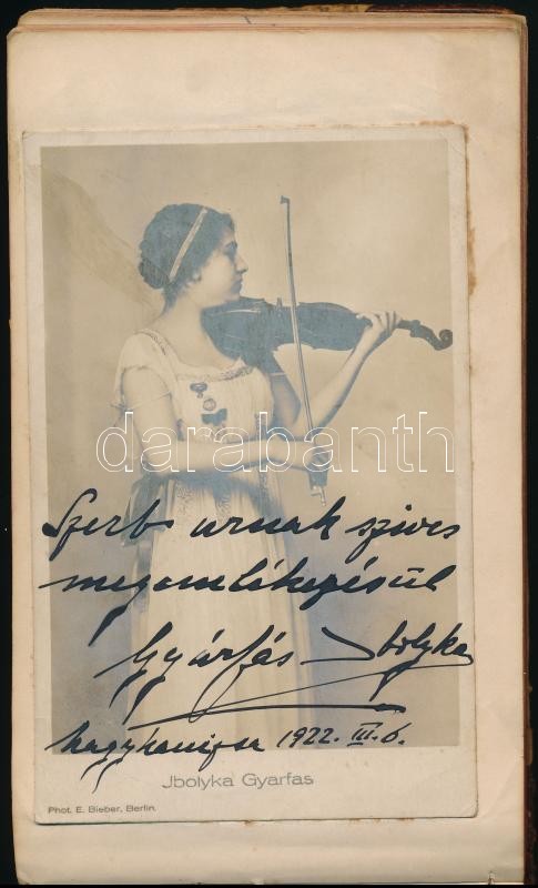 Aláírás gyűjtemény, beragasztott fotólapokkal, fotókkal, benne Koncz János Herczeg Jenő, Salamon Béla, Gyárfás Ibolyka, Szikla Adolf, Rott Sándor, Medgyaszay Vilma, Dohnányi Ernő, Kerpely Jenő, Baktay Ervin, Rökk Marika, Földes Jolán, Salamon Béla és mások aláírásaival. Kopott haránt-alakú félbőr-kötésben.
