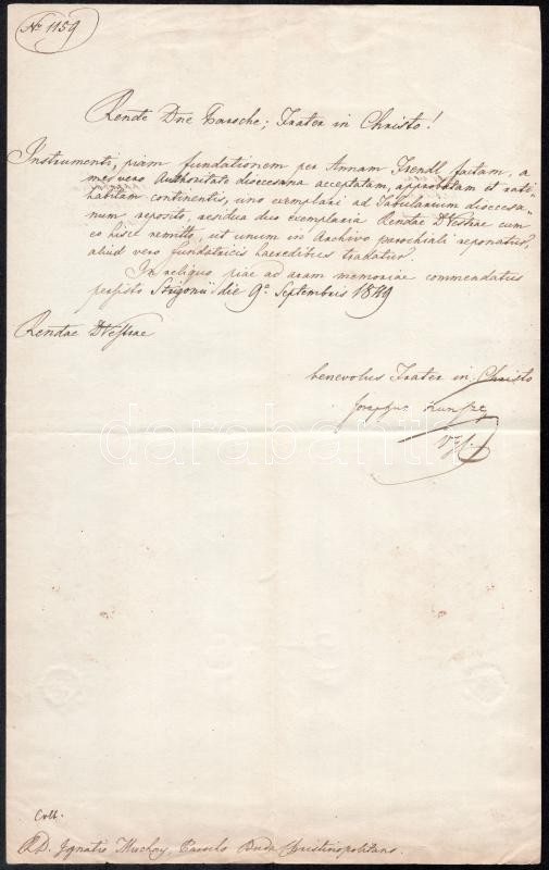 1849 Kunszt József (1790-1866) leendő kalocsai érsek által aláírt egyh...