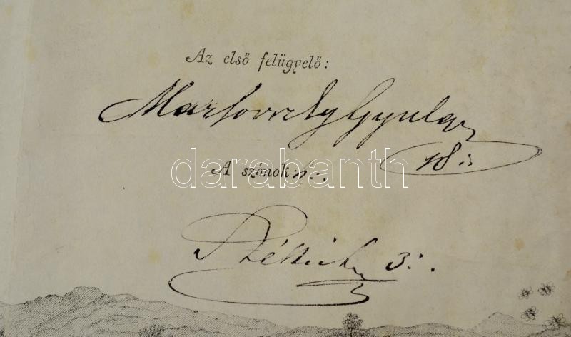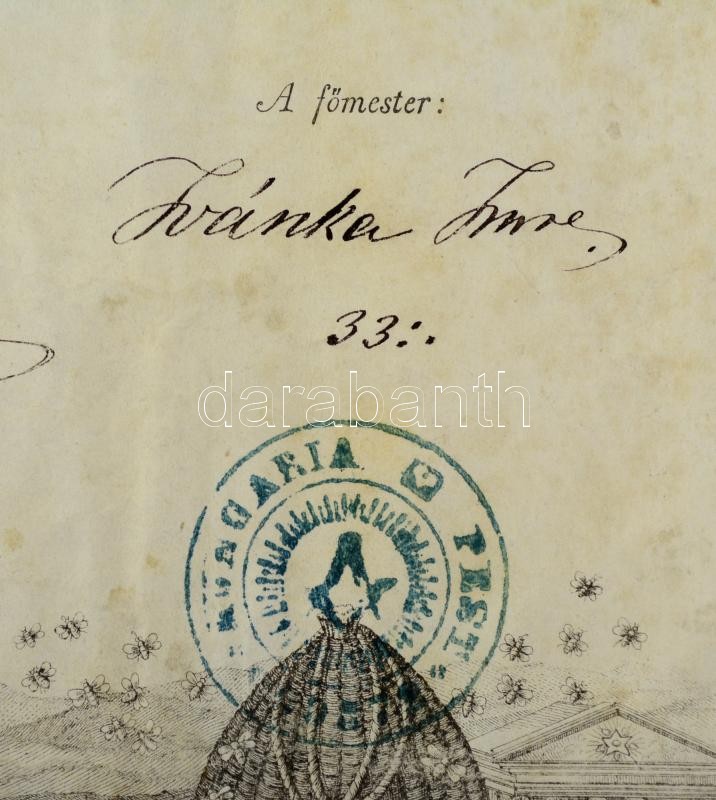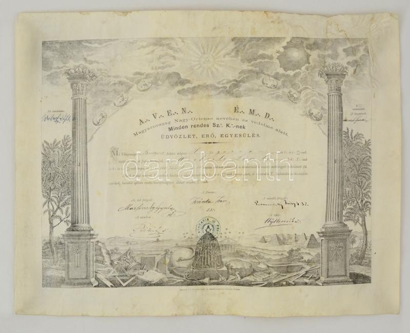 1875 Szabadkőműves mesteri oklevél Magyarország Nagy-Oriense nevében Wekerle László (1840-1918) tanfelügyelőnek, több neves szabadkőműves aláírásával. A főmester: Ivánka Imre (1818-1896) 1848-as honvédezredes, Batthyány Lajos miniszterelnök titkára. A második felügyelő Podmaniczky Frigyes báró (1824-1907), Hátoldalán Joannovics György (1821-1909) politikus, nyelvész, újságíró, nagymester és a Humboldt páholy más tagjainak aláírásával. Nagyméretű pergamen, rézmetszetes grafikával. /