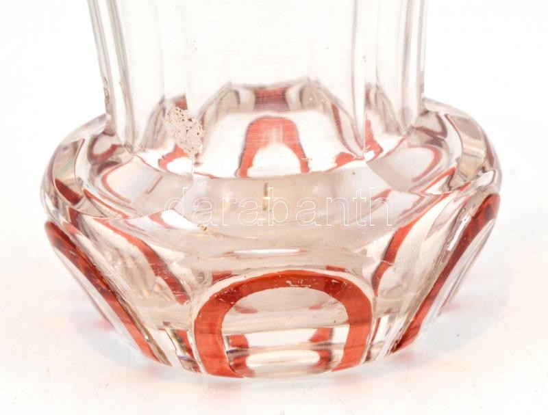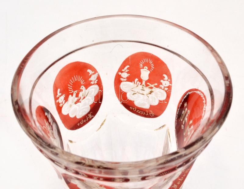 XIX. sz. vége: Rubinvörös pohár, a szerelem, barátság, hosszú élet, hit allegórikus ábrázolásával. Többrétegű, kézzel festett, hámozott, csiszolt, kézi festés, két kis csorbával 12,5 cm / Handpainted antique glass with allegoric images of love, raith, peace, luck, long life. With two damages. 12,5 cm