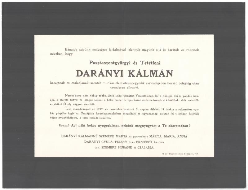 Description: 1939 Pusztaszentgyörgyi és tetétleni Darányi Kálmán (1886-1939) politikus, földművelésügyi miniszter (1935-1938), belügyminiszter (1937-1938), Magyarország miniszterelnöke (1936-1938) és képviselőház elnökének (1938-1939) gyászjelentése.